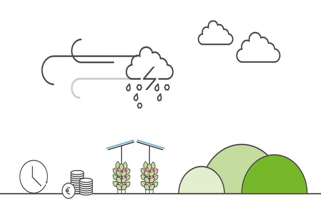 Our specially designed transparent solar panels are ideal for berries like raspberries, currants, blueberries, strawberries and blackberries. The substructure can also be designed in such a way that cultivation in soil is possible, e.g. for perennial raspberries. In the case of cultivation in a substrate, the rotation of crops plays a role with regard to soil exhaustion. The same is true for perennial crops, such as espalier fruit or wine grapes, especially considering that these crops are in place for over 15 years and might then be replanted or grafted.