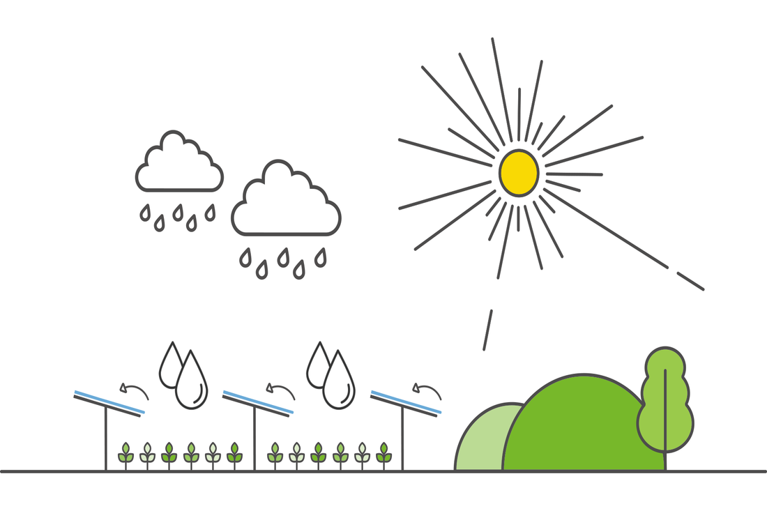 The availability of water, to the extent influenced by the Agri-PV system, is adapted to the growing conditions of the crop in question. We take care to ensure a uniform distribution of rainwater for the crops beneath the Agri-PV system, and this can be optimized through extra technical equipment. Beneath an Agri-PV system there will also always be some areas that aren’t covered by solar collectors.